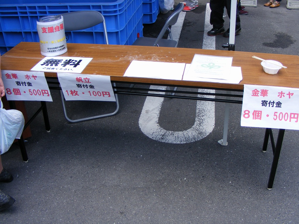 6月1日(日)立町の北日本銀行駐車場内で午前9:30~寄磯養殖部会が主催する「金華ほや、帆立復興感謝祭」が開催されています。 午前11:00過ぎに覗いてみると、たくさんの方々がみえていました。 お目当ての「ほや、帆立」速攻で無くなったようです。午後3:00頃まで開催されているようです。ぜひ足を運んでみては? *路上駐車は、厳禁です。 午前中は、路上駐車で車両の往来が支障したしていたようです。