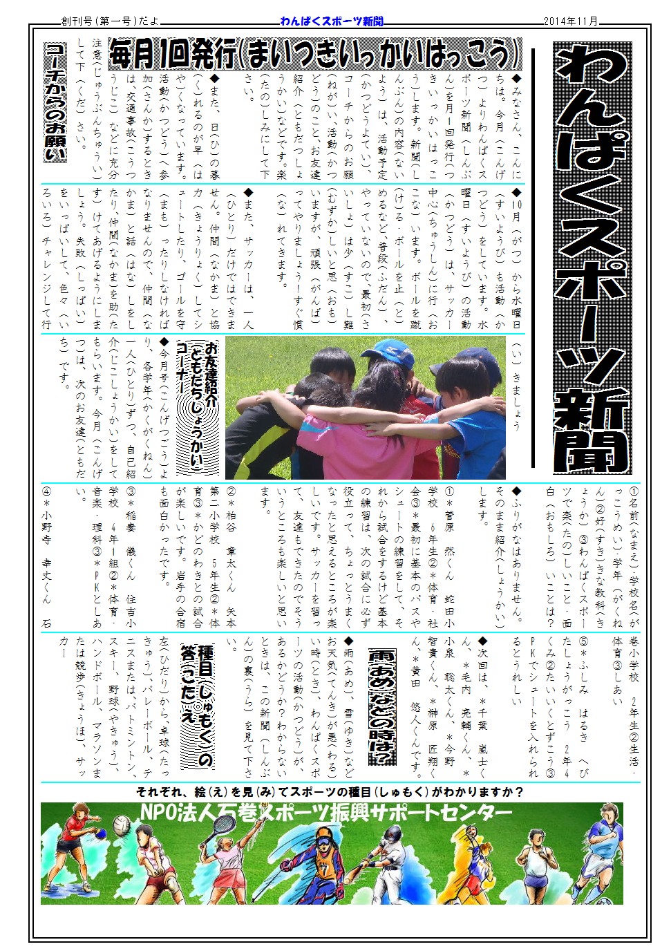 わんぱくスポーツ新聞の創刊です。11月中旬より、毎月1回発行します。 新聞の内容は、活動予定、コーチからのお知らせ、お友達紹介やクイズ、また雨天時などの連絡体制を掲載して行きます。 子ども達が、楽しみに待っていただけるような内容にして行きたいと思います。